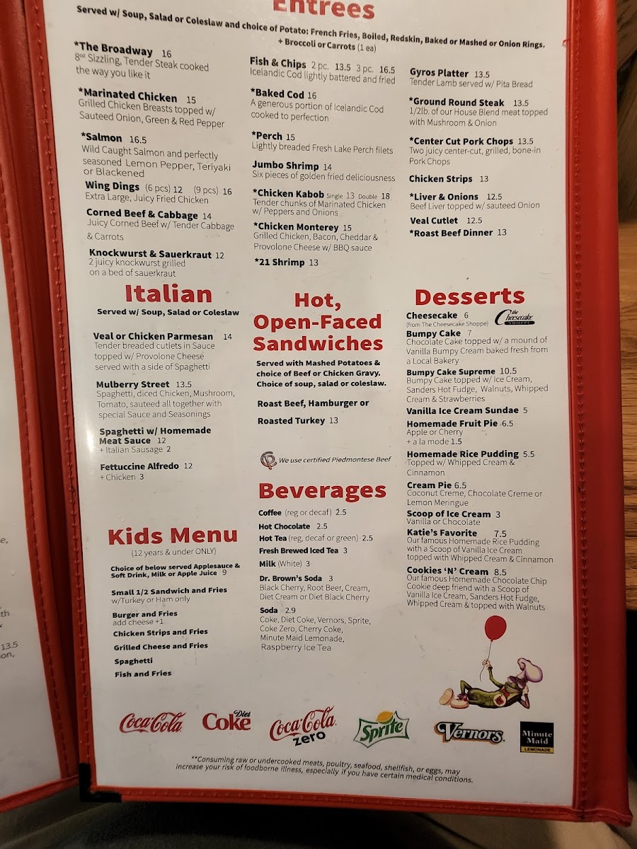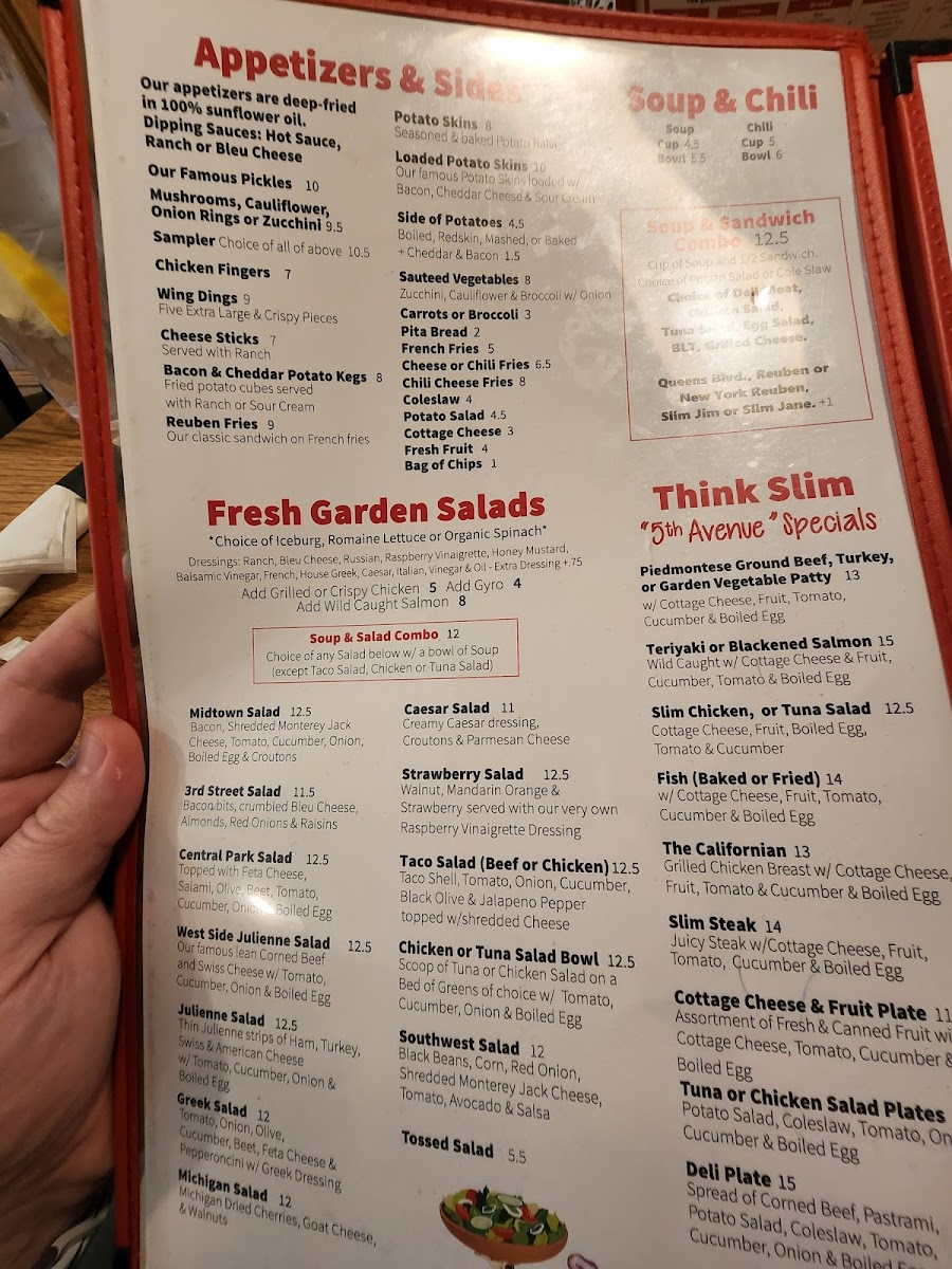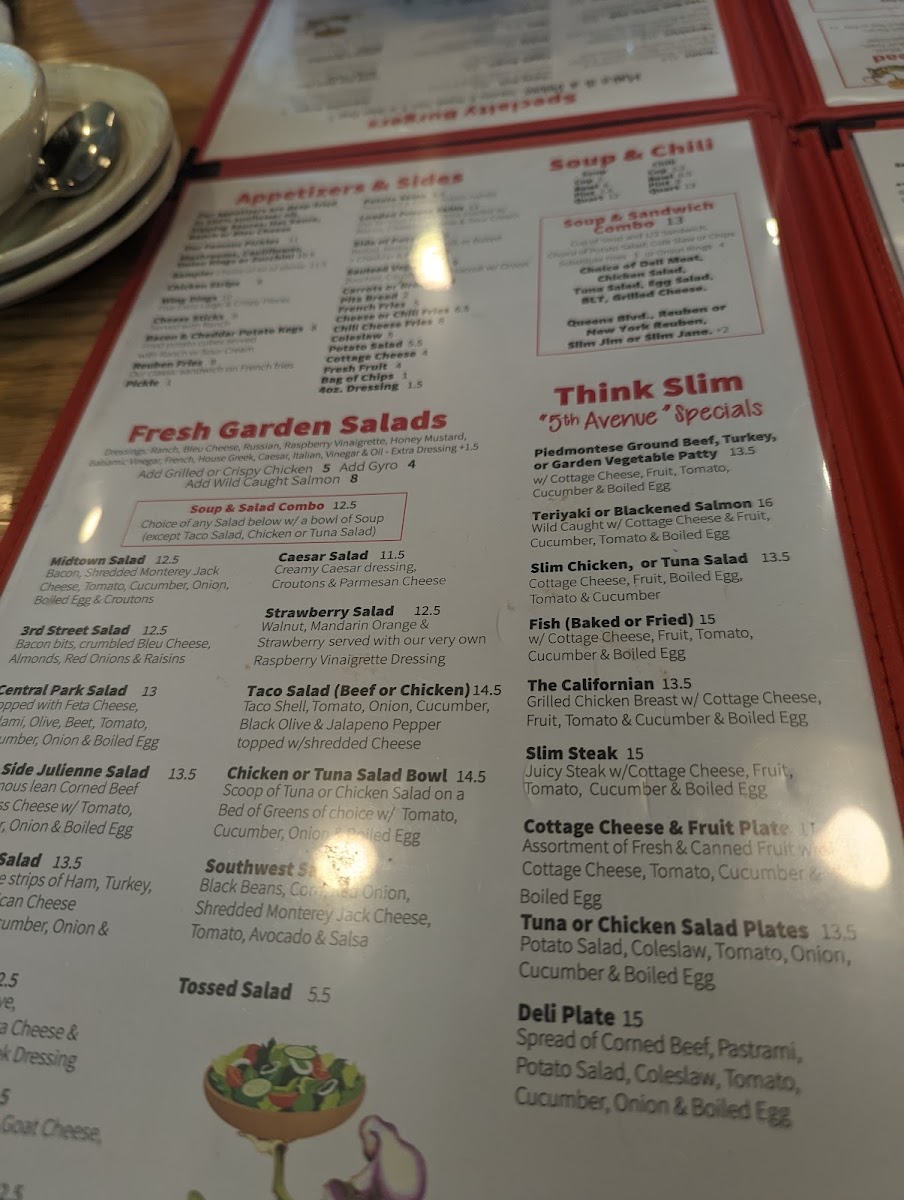 But that’s not all; the Think Slim "5th Avenue" Specials are perfect for those looking for lighter fare without compromising on taste. Options like the Cottage Cheese & Fruit Plate and Slim Chicken Salad, served with an assortment of fresh fruits, are both nutritious and delicious, proving that healthy eating can be a flavorful affair.